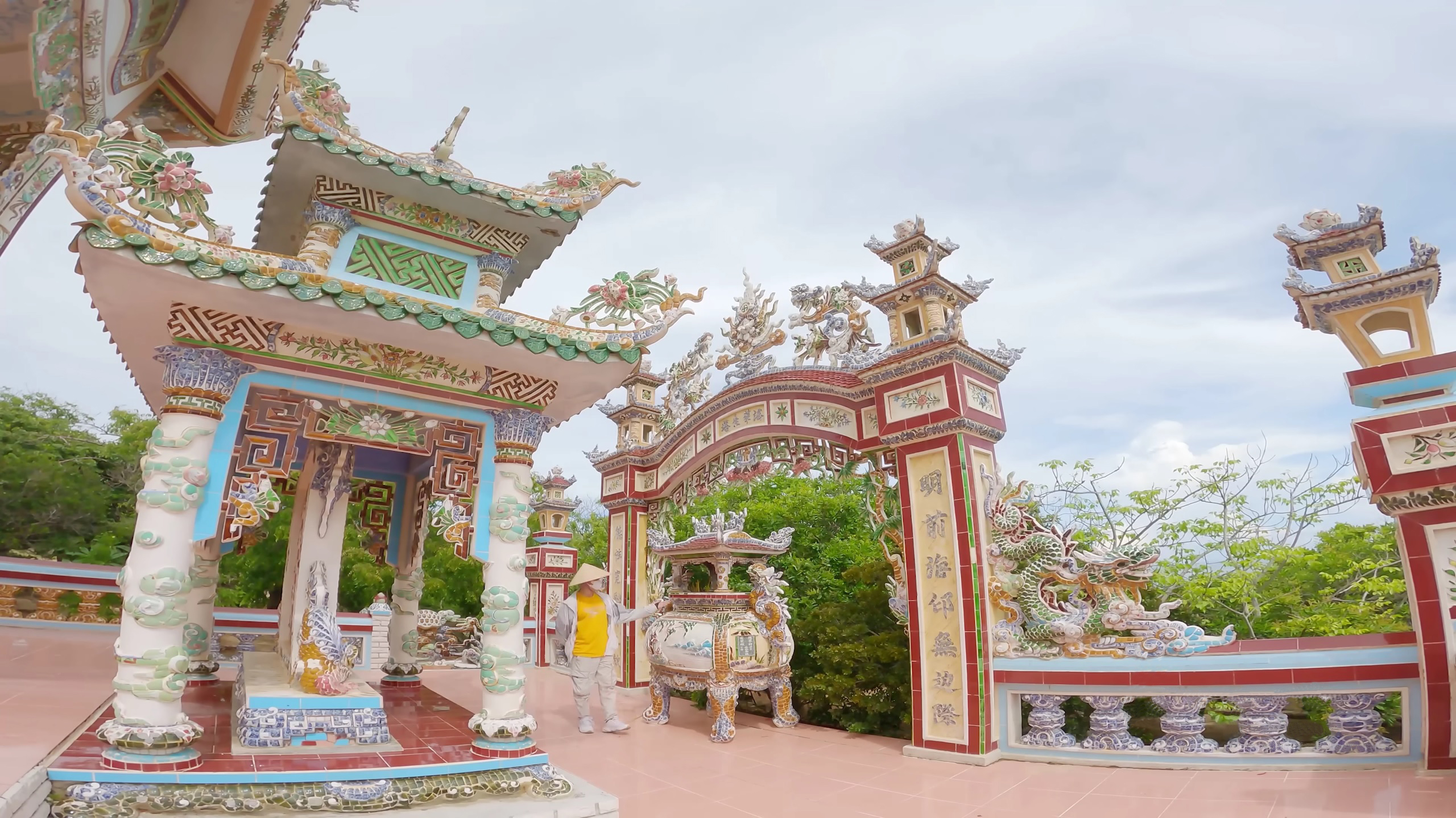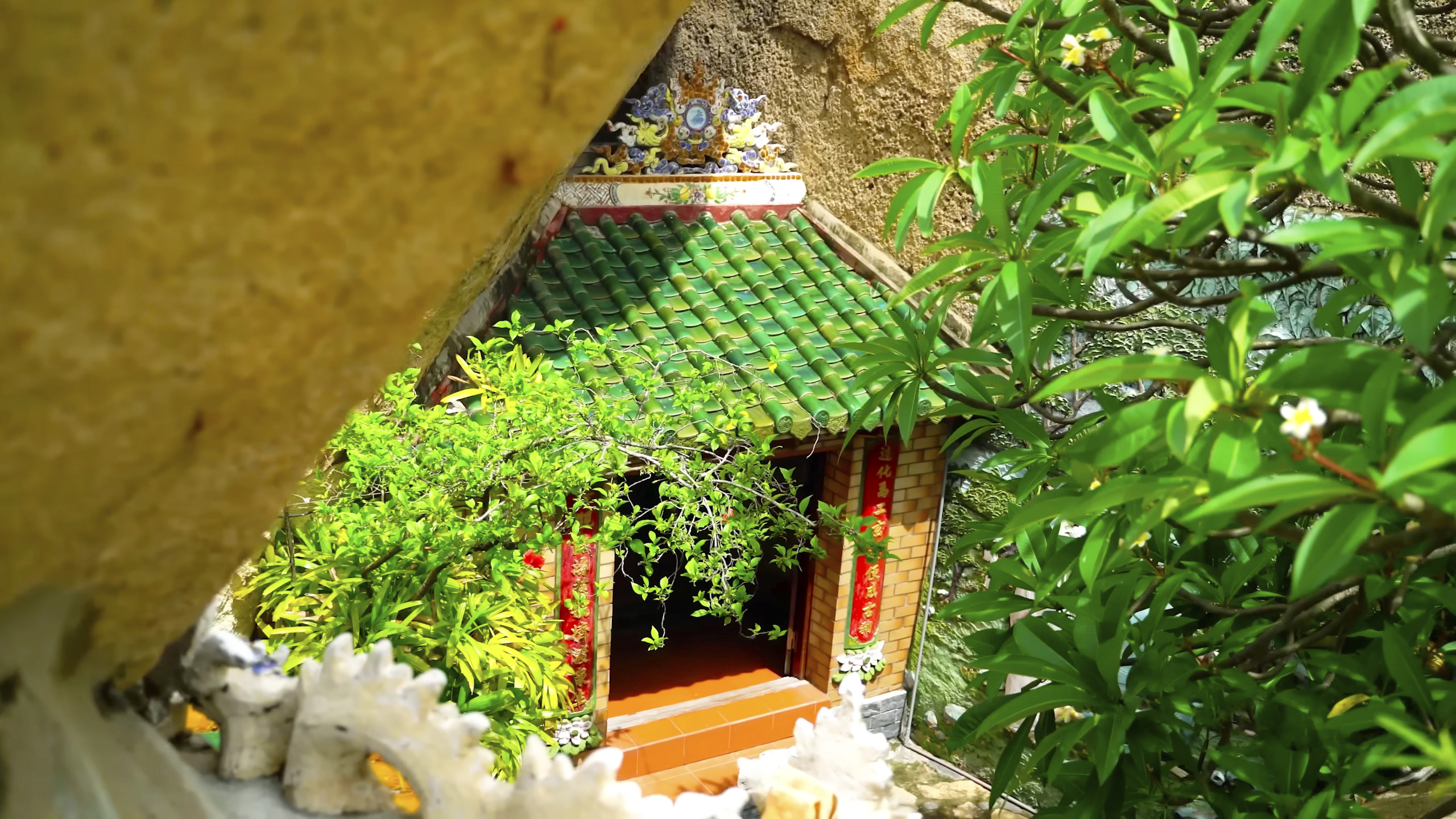 Qua khỏi Cổng Tam quan là bước vào sân chùa, những hạng mục kiến trúc chính được bố trí bao quanh sân chùa. Đối diện với Cổng Tam quan là 3 phiến đá tự nhiên nổi lên cao vút như xếp sẵn thành một hàng ngang, phiến đá bên phải có hình dáng giống con cá kình, kinh Phật gọi là con “Ma Kiệt” - một loại thủy vật được xem là hóa thân từ Quan Thế Âm Bồ Tát thường giúp đỡ ngư dân khi gặp nạn ngoài khơi, tảng đá này được sử dụng để xây Lầu chuông hình tháp 2 tầng bên trên. Phía bên tả là tảng đá có hình dáng như chiếc thuyền Bát Nhã được sử dụng để xây Lầu trống có kiểu dáng tương tự như Lầu chuông. Tảng đá ở giữa có dáng giống như con cóc, kinh Phật gọi là con “Thiện Trùng” - con vật hiền lành tượng trưng cho sự thanh tịnh nơi cửa Phật.