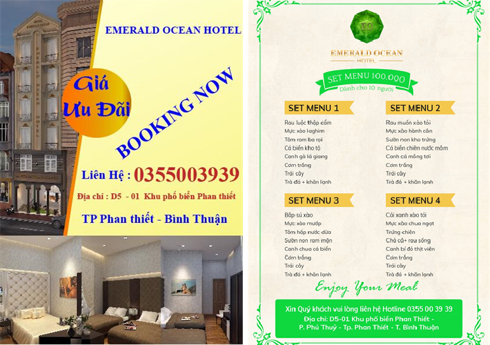 Tọa lạc trong khu Đô thị du lịch biển Phan thiết, nơi được xem là trái tim và là trung tâm du lịch của Thành phố, cách thủ đô du lịch Mũi Né 10 phút láy xe. Emerald Ocean Hotel là điểm đến lý tưởng cho Quý khách dừng chân nghĩ dưỡng. Khách sạn nằm ngay tại bãi biển Đồi Dương, liền kề nhiều công viên đẹp: Công viên Cầu vồng, công viên Lộc Vừng và Công viên Hòa Bình, nơi Quý khách có thể check-in cùng người thân để lưu giữ những kỉ niệm đẹp.Ở đây, quý khách chỉ mất khoảng 5 phút đi bộ ra biển, 5 phút đi bộ tới siêu thị, trung tâm thương mại và giải trí của thành phố Phan thiết. Hệ thống phòng được thiết kế trang nhã, đầy đủ tiện nghi nhằm mang lại sự hài lòng và thỏa mái cho quý khách trong kỳ nghĩ dưỡng. Sở hữu nhiều phòng có nhiều view đẹp theo kiến trúc sang trọng, hiện đại, đầy đủ tiện nghi như: city view Superior, city view Deluxe, Standard, seaview superior, seaview deluxe,… song mỗi loại phòng lại mang một tính năng và nét đặc sắc riêng. đặc biệt, ban công rộng của các phòng tạo sự dễ chịu cho du khách mỗi khi trở về. <strong>TẠI SAO LỰA CHỌN EMERALD OCEAN HOTEL</strong> Đến với emerald ocean hotel, bạn không chỉ đến nghỉ dưỡng tại 1 khách sạn, mà bạn đang về “nhà” tại Phan Thiết nhờ sự phục vụ tận tâm của đội ngũ nhân viên nhiệt tình, chuyên nghiệp. Bất cứ khi nào bạn gặp khó khăn hay cần trợ giúp, nhân viên khách sạn sẽ lập tức có mặt để hỗ trợ du khách hiệu quả nhất có thể. Đặc biệt, chất lượng dịch vụ của Emerald Ocean Hotel đã được nhiều du khách công nhận và mong muốn được trở lại khi đến Phan Thiết. Emerald Ocean Hotel hiểu rằng đây mới là giá trị đích thực vì được khách hàng tin tưởng cho kỳ nghỉ, chuyến công tác của mình. Với dịch vụ chuyên nghiệp, tận tình, Emerald Ocean Hotel đảm bảo mang đến cho bạn một kỳ nghỉ dưỡng đáng nhớ tại thành phố biển. Ngoài ra, còn có các dịch vụ đi kèm như lễ tân 24/24, phục vụ phòng, mini bar tại lầu bảy phục vụ nhiều loại nước uống thơm ngon, xe đưa đón tại sân bay - bến tàu, wifi miễn phí trong phòng và bên trong khách sạn, dịch vụ xe đạp Miễn Phí, phục vụ các món ăn ngon, hải sản tại nhà hàng,… để quý khách không mất thời gian di chuyển, đều được emerald ocean hotel chú trọng. Chúng tôi tinh rằng EMERALD OCEAN HOTEL chính là địa điểm hoàn hảo để quý khách có một kì nghĩ dưỡng tuyệt vời. Thu gọn