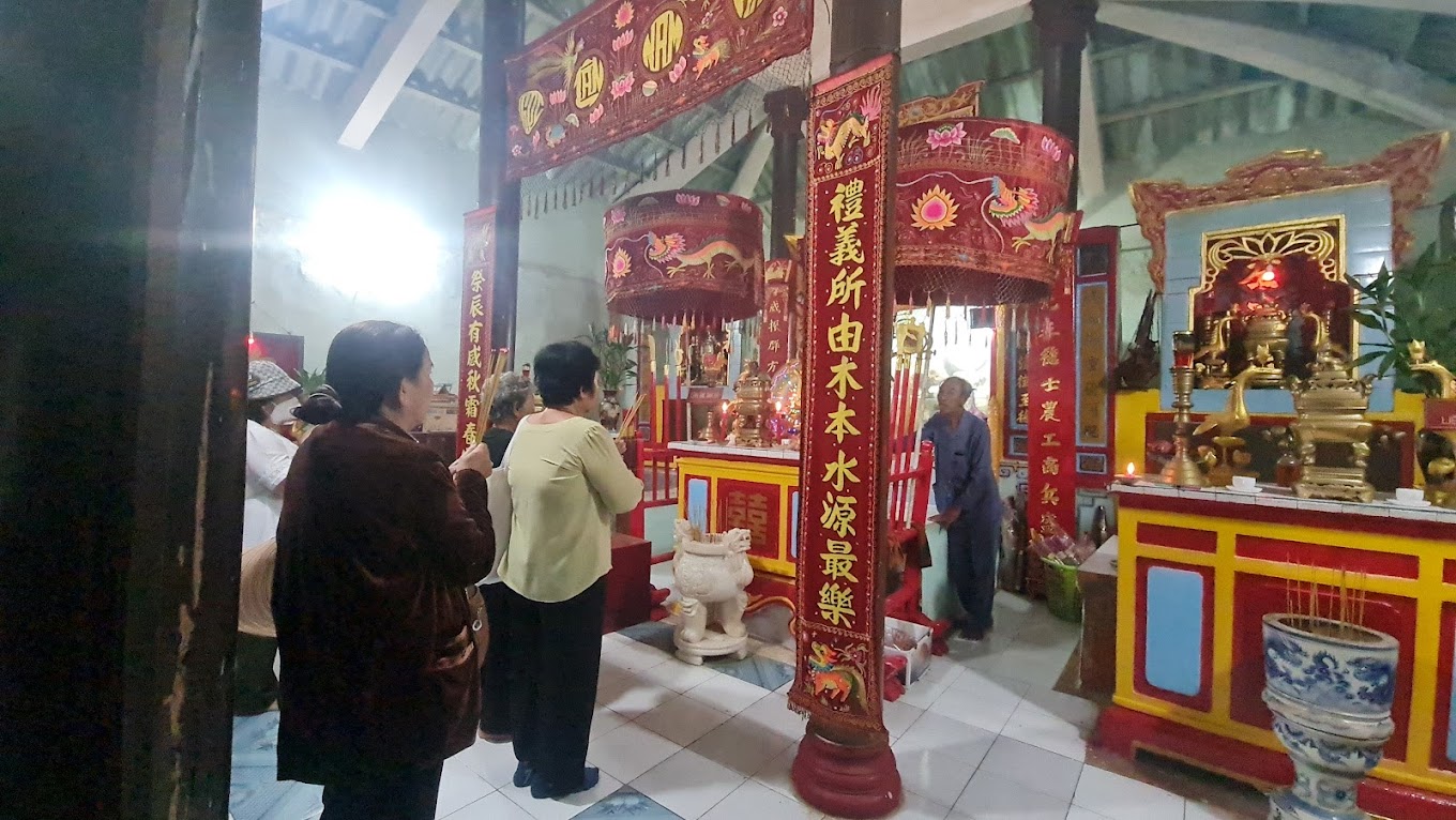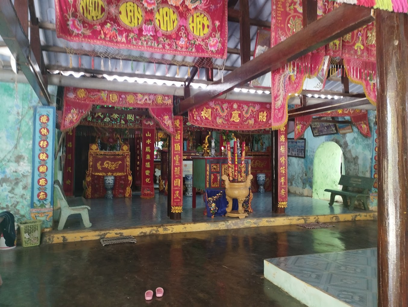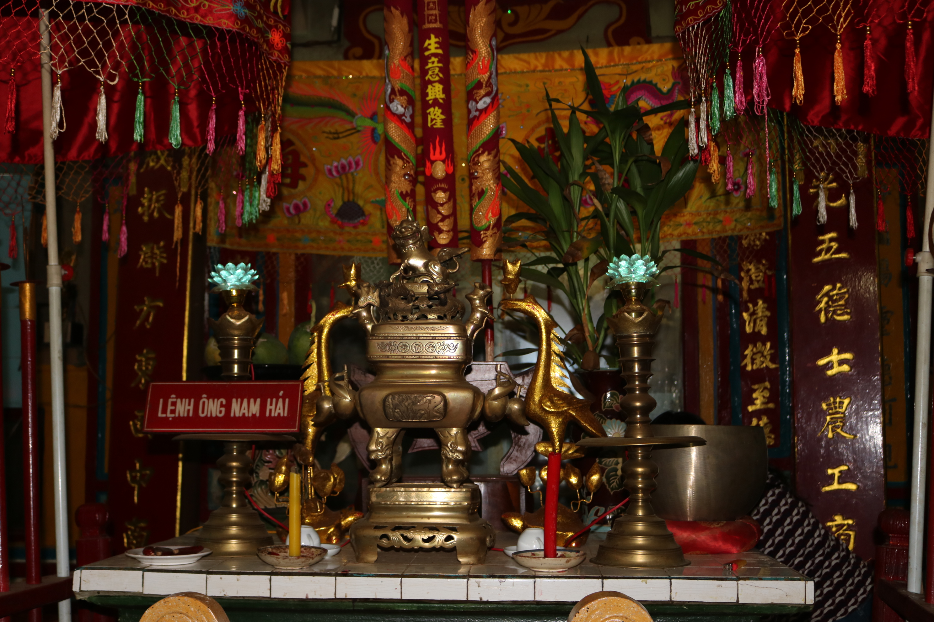 Khu chánh điện có ba nếp nhà mái kép đặt song song theo bố cục chữ Tam. Kết cấu công trình theo lối “chồng rường” bằng loại gỗ quý hiếm, đá phiến và san hô. Hệ thống cửa thông nhau theo kiểu mái vòm tạo cảm giác sâu thẳm, ấm cúng. Chánh cung có ba gian, điện thờ năm gian, phía sau là hệ thống tẩm thờ lưu giữ hài cốt ông Nam Hải.
